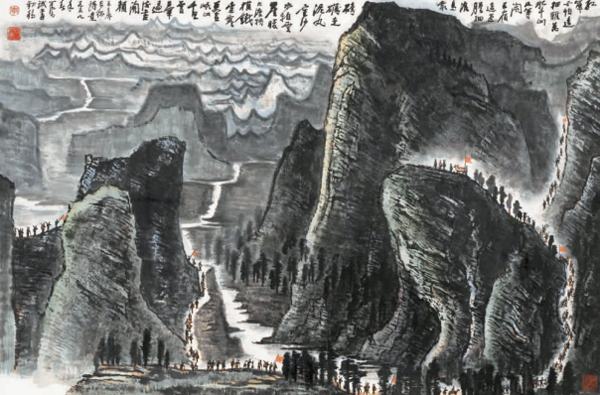 【国画《长征》李可染作品,1959年】《长征》中,景物横向展现,层峦叠嶂,如犬牙交错,参差错落,雄奇壮丽,红军队伍沿着狭窄曲折的山路从左往右横越画面。